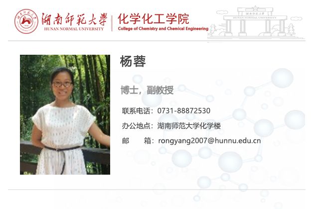 杨蓉,女,1982年2月生,籍贯湖南省长沙市,汉族,太阳集团电子游戏讲师。2000-2004年在四川大学化工学院制药工程专业获得学士学位,2004-2007年在四川大学化工学院生物化工专业获得硕士学位,2007年起在太阳集团电子游戏任教至今,主要承担制药工程专业的《药物制剂工程》、《制药设备与工艺设计》、《药物制剂工程实验》等课程的教学工作,曾荣获2012-2013年度、2016-2017年度太阳集团电子游戏教学优秀奖和2017-2018年度太阳集团电子游戏树达学院教学优秀奖。教学研究工作方面主要从事高等院校工科教学研究工作,主持并完成湖南省省级教学改革研究项目一项,近年发表教研论文6篇,其中5篇发表在北大中文核心期刊《化学教育》上,1篇发表在国家化学教育权威期刊《Journal of Chemical Education》上。科研方面主要从事天然产物有效成分分离和分析方法的研究工作,主持并在研湖南省中医药科研计划一项,主持并完成校级青年基金一项,参与国家自然科学基金面上项目一项、湖南省科技厅项目一项。