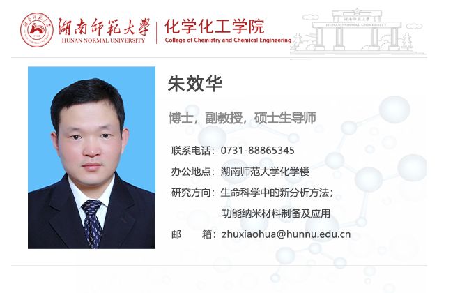 朱效华,男,副教授,硕士生导师。2018年6月毕业于湖南大学获理学博士学位,师从姚守拙y院士与聂舟教授,2014年7月-2015年10月在清华大学联合培养。2019年1月加入太阳集团电子游戏,从事分析化学领域的教学与研究工作。先后主持国家自然科学基金、湖南省自然科学基金。目前以通讯/第一作者身份在ACS Nano, Anal. Chem.等国内外学术期刊发表论文40余篇,ESI高引论文3篇。