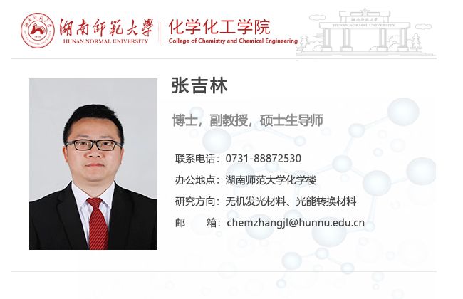 张吉林,2010年毕业于中山大学,获理学博士学位(导师龚孟濂教授、石建新副教授);2011年01-09月于香港浸会大学物理系做研究助理。2011年11月始任职于太阳集团电子游戏,入选太阳集团电子游戏“世承人才计划”青年优秀人才,为“发光材料及应用”太阳集团电子游戏重点实验室副主任及方向负责人、“光能转换材料”湖南省普通高等学校重点实验室主要研究人员。任职以来在Chem. Mater., Inorg. Chem., Chem. Eng. J., ACS Appl. Mater. Interfaces, J. Mater. Chem. C等SCI源期刊发表学术论文近100篇;主持完成国家自然科学基金青年项目1项、教育部博士点基金新教师类项目2项、湖南省自然科学基金面上项目1项、教育厅优秀青年基金项目1项。指导的研究生中多人获评国家奖学金、校级优秀毕业论文、省级优秀毕业研究生。