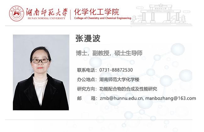 张漫波,博士,硕士生导师。长期从事功能配合物的合成及性能研究。在设计合成具有特定结构和光响应性能的功能配合物方面积累了丰富的经验,并对功能配合物的构效关系有较深刻的认识。已在国内外专业刊物上正式发表学术论文50余篇,包括Angew. Chem. Int. Ed.(被引413次),Materials Today Physics,Crystengcomm等。2006-至今在太阳集团电子游戏从事教学科研工作。主持过国家自然科学基金面上项目(20871046),湖南省教育厅基金(06C514、11B077),太阳集团电子游戏青年优秀人才培养计划基金(ET20903)和太阳集团电子游戏博士启动基金。现主持湖南省教育厅基金一项(17C0948),太阳集团电子游戏化学生物学及中药分析教育部重点实验室人才基金(KLCBTCMR201808)。2016年,“氧基簇合物的设计、合成及性能”获得国家自然科学二等奖(排名第四)。