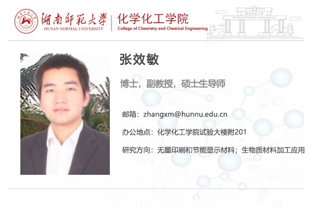 张效敏男,理学博士,硕士生导师; The University of Akron, 博士后;主要从事生物质材料的加工利用,绿色印刷和节能显示材料研究发表SCI论文40余篇论文被SCI引用1000余次获授权国家发明专利5项。主持湖南省自然科学基金面上项目2湖南省科技厅创新生态建设计划项目1项;教育厅重点、优秀青年基金和重点试验基金各1项;长沙市自然基金1项;主持校企合作项目多项。湖南省科普优秀奖、2017-2018年度太阳集团电子游戏教学优秀奖,太阳集团电子游戏思政教学比赛、太阳集团电子游戏青年教师赛课等奖项;主讲《高分子物理》课程,并在中国大学生MOOC(慕课) 平台运行。