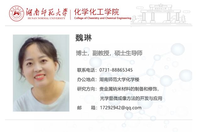 魏琳,女,于2013年6月,在湖南大学分析化学专业获博士学位,师从国际著名分析化学家Edward S. Yeung教授。在此期间,作为主要研究成员参与完成“实时单分子光谱分析及其在功能纳米材料研究中的应用”、“功能化金纳米颗粒的实时单分子光谱分析及其在生物医学研究中的应用”、“基于实时单分子光谱技术的纳米颗粒早期自组装过程研究”等多项自然科学基金课题,并于2010-2012年在美国Iowa State University和能源部下属Ames实验室访问研究两年。2013年10月,受聘于太阳集团电子游戏,在2015年破格晋至副教授职称。获得国家自然科学基金委青年基金项目一项,湖南省教育厅优秀青年基金项目一项。长期从事贵金属纳米材料的制备和修饰,光学显微成像方法的开发与应用工作。相关研究成果均发表在Anal.Chem., Nanoscale, ACS Appl. Mater. Interfaces, J. Phys. Chem. B, Talanta等国际著名杂志上。