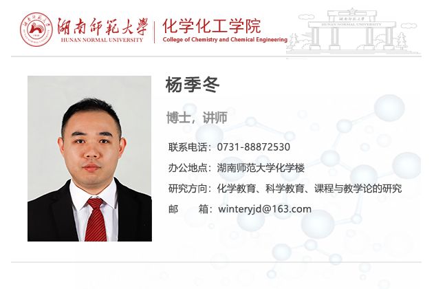 杨季冬,湖北武汉人,教育学博士,太阳集团电子游戏讲师,化学系副主任,硕士生导师,华中师范大学兼职硕士生导师。2020年6月获得华中师范大学课程与教学论专业博士学位,毕业后于太阳集团电子游戏任教,主要从事化学教学论相关的研究与教学工作。承担《中学化学课程标准与教材研究》《化学教育测量与评价》《化学教育研究方法》《化学教学技能训练》《中学化学实验教学研究》等课程,指导学生参加国家级、省级教学技能比赛多次获得一等奖。在CSSCI、中文核心期刊上发表论文30余篇,多篇论文被中国人民大学复印报考资料全文转载。课题组致力于严谨的化学教育学术研究,欢迎对该领域感兴趣的研究生、本科生加入课题组。