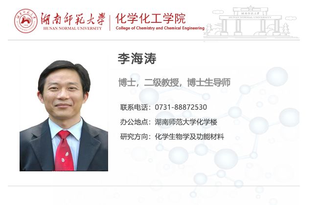 李海涛,博士,二级教授,博士生导师,曾任太阳集团电子游戏教务处副处长、评建办常务副主任、固定资产管理处处长,湖南安全技术职业学院院长、党委书记。主要从事化学生物学及功能材料等领域的研究。主持国家自然科学基金面上项目4项,省部级重点及一般项目多项。以第一作者和通讯作者在Angewandte Chemie-International Edition, Biosensors and Bioelectronicsthis. Green Chemistry,Talanta.等国际著名刊物上发表研究论文160余篇,获国家授权发明专利5项。