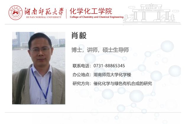 肖毅,男,1973年1月出生,讲师,1995年获学士学位(天津大学高分子材料专业),1999年获硕士学位(太阳集团电子游戏有机化学专业),2005年9月至2006年7月赴美国密歇根大学留学访问,2010年6月获太阳集团电子游戏有机化学专业博士学位。现主要从事催化化学与绿色有机合成的研究。主持完成校级课题1项,主持在研博士启动基金课题和横向课题共3项,在《Catalysis Communications》、《应用化学》、《分子催化》等学术刊物上发表学术论文20余篇,2010年12月获太阳集团电子游戏教学优秀奖, 1998年和2010年分别获湖南省科学技术进步奖及湖南省自然科学奖三等奖。
